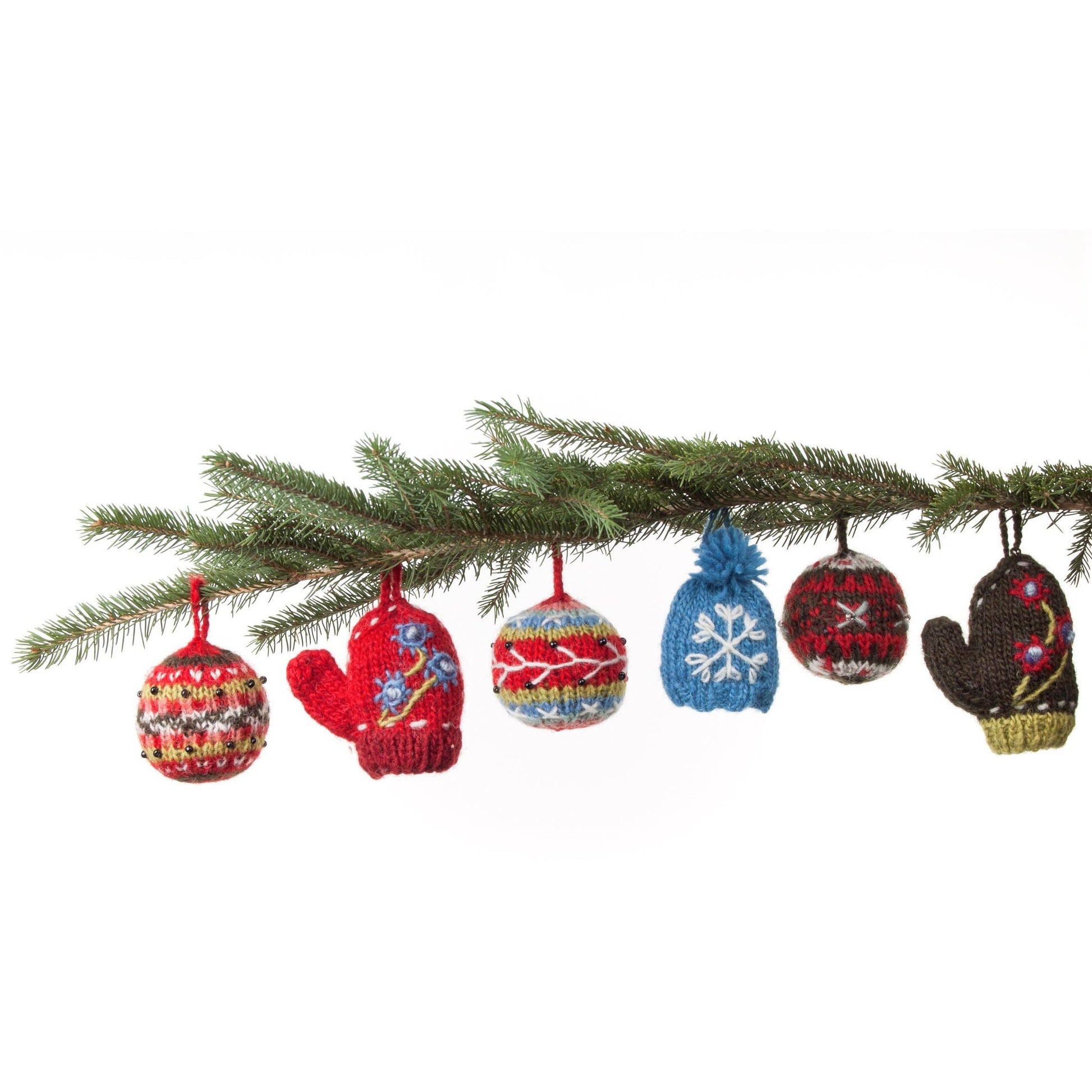 Hand-knitted wool ornaments in Nordic-inspired baubles. An essential addition to your family's festive tradition. One of each.