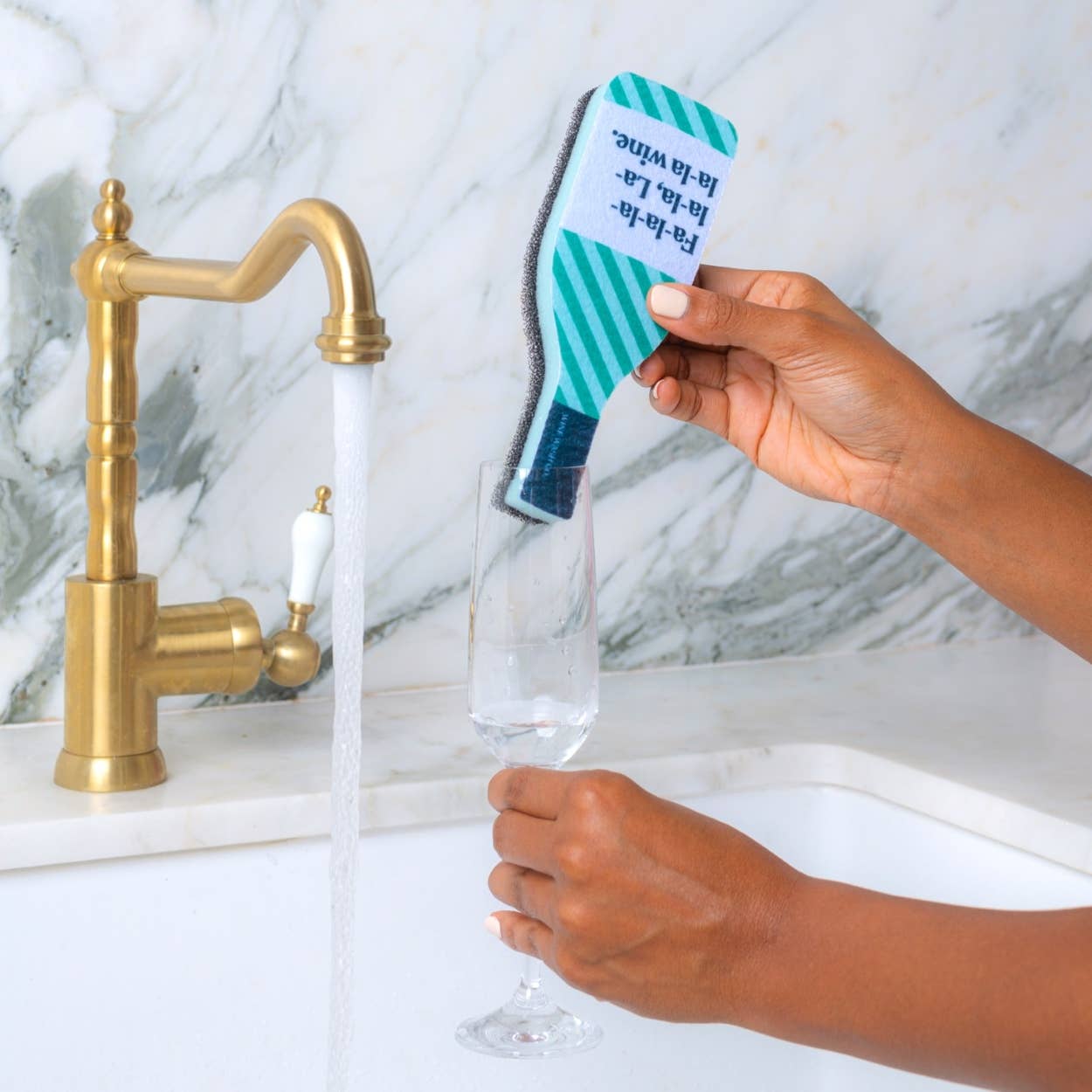 Add a *pop* of fun to your kitchen with our "Fa-la-la-la-la, la-la-la wine" green striped cleaning sponge. These wine-shaped sponges are great for light housework. The perfect stocking stuffer for the tidy wine lover! The narrow neck makes it easy to clean inside wine glasses and champagne flutes. Features: * Perfect for washing wine glasses & stemware * A scrubber lines the bottom for extra tough spots * Non-scratch, so it's safe to use on your glassware * Each sponge is approximately 7.25 x 2.5 x 1.25" Care: Rinse and wring out after each use to keep the sponge party going.