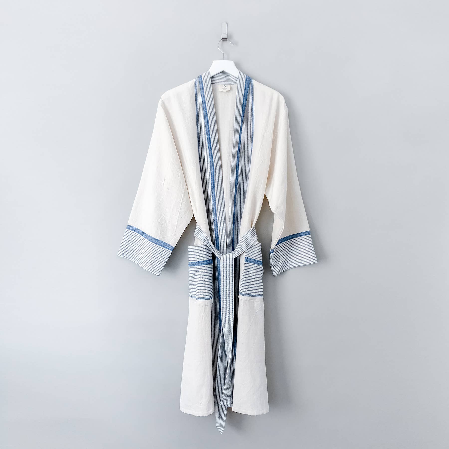 Our Ivory Blue Tribeca long bathrobe is tailored using our signature handwoven 100% Turkish cotton fabric — lightweight, highly absorbent, and quick to dry. It features two front pockets and a tie around the waist. We recommend washing it first as it will get softer and more absorbent with each wash! Perfect for an after shower lounge or as light jacket. Available in three sizes.