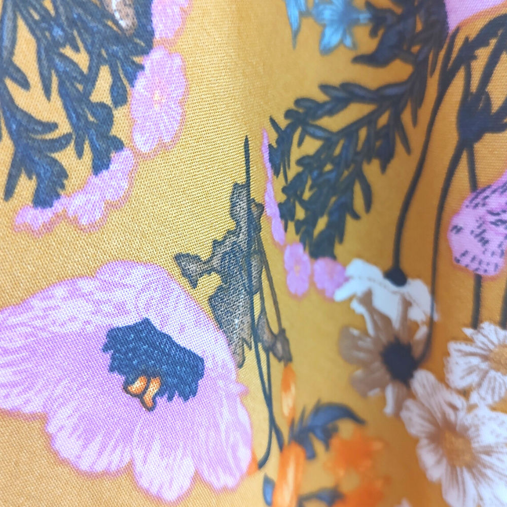 Lovely quality cotton kimono. Thistle & Peonies Ochre print with breathable sleeves and a belt that ties around the waist. It has a lovely floral design. Great to wear around the house or to dress up with some jeans & a T shirt to go out.
