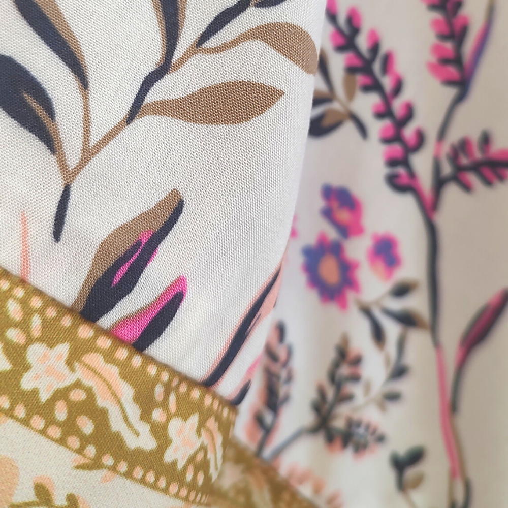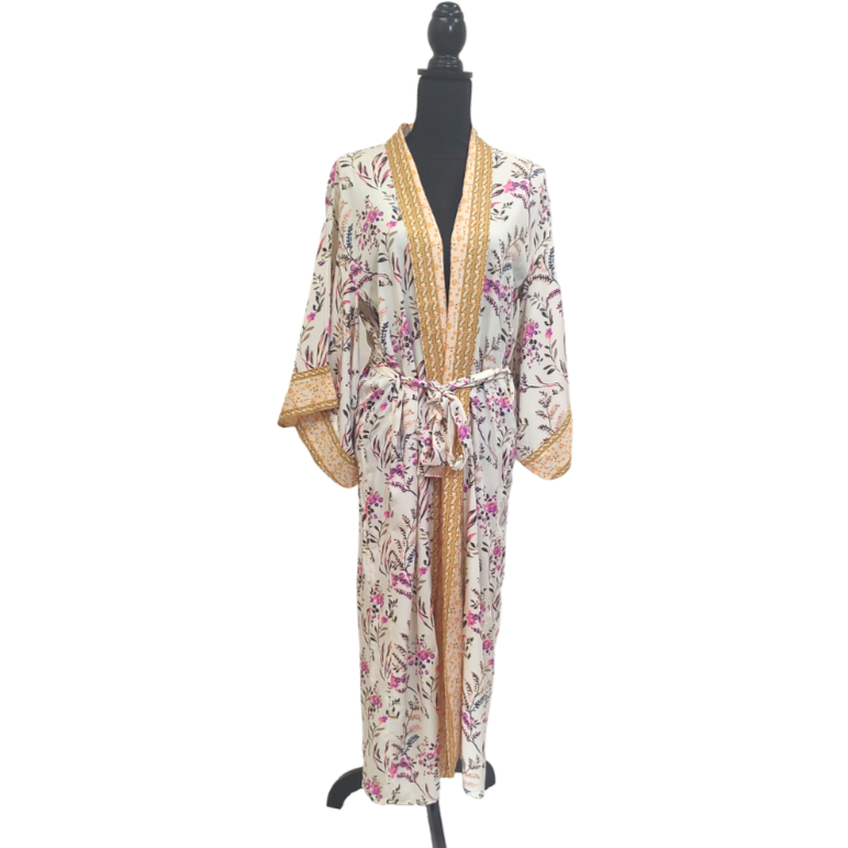 Ivory Floral, Pink Cherry Blossom & Foliage- Imagine sipping your tea on the balcony! Our kimonos are great because they’re so versatile & add a bit of color to any outfit -Perfect gift for sisters and bridesmaids. Great to wear around the house or to dress up with some jeans & a T shirt to go out.